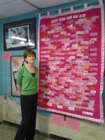 Principal Fullerton-Kelly next to the school’s antibullying quilt