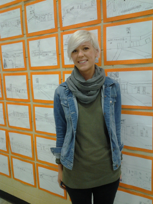 Art teacher Tara Prokosh in front of her students’ drawings