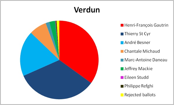 Jeffrey Mackie achieved 2% for the Green Party and Marc-Antoine Daneau got 1% for the Option Nationale.